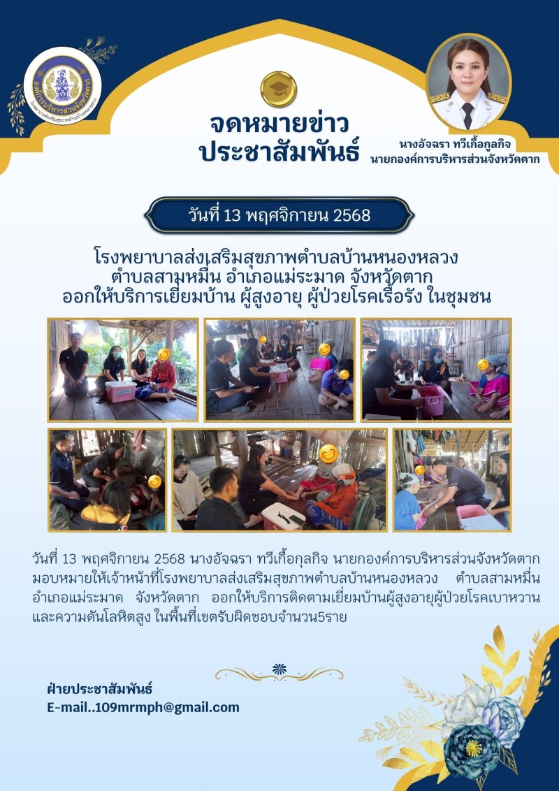 วันที่ 13 พฤศจิกายน 2568 นางอัจฉรา ทวีเกื้อกุลกิจ นายกองค์การบริหารส่วนจังหวัดตาก มอบหมายให้เจ้าหน้าที่โรงพยาบาลส่งเสริมสุขภาพตำบลบ้านหนองหลวง ตำบลสามหมื่นอำเภอแม่ระมาด จังหวัดตาก ออกให้บริการติดตามเยี่ยมบ้านผู้สูงอายุผู้ป่วยโรคเบาหวานและความดันโลหิตสูง ในพื้นที่เขตรับผิดชอบจำนวน 5 ราย