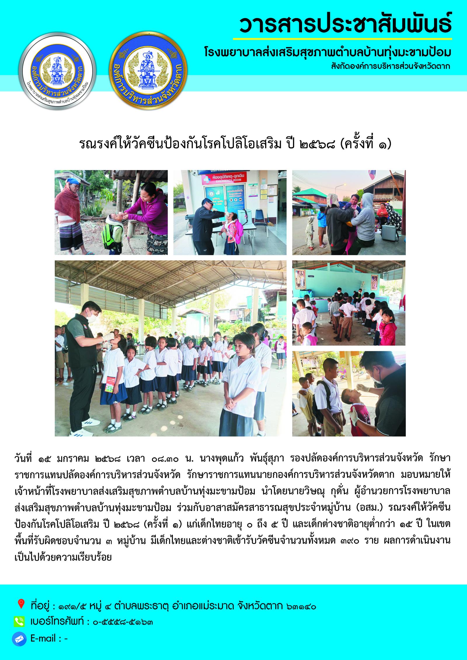 เจ้าหน้าที่โรงพยาบาลส่งเสริมสุขภาพตำบลบ้านทุ่งมะขามป้อม นำโดยนายวิษณุ กุดั่น ผู้อำนวยการโรงพยาบาลส่งเสริมสุขภาพตำบลบ้านทุ่งมะขามป้อมร่วมกับอาสาสมัครสาธารณสุขประจำหมู่บ้าน (อสม.) รณรงค์ให้วัคซีนป้องกันโรคโปลิโอเสริม ปี ๒๕๖๘ (ครั้งที่ ๑)