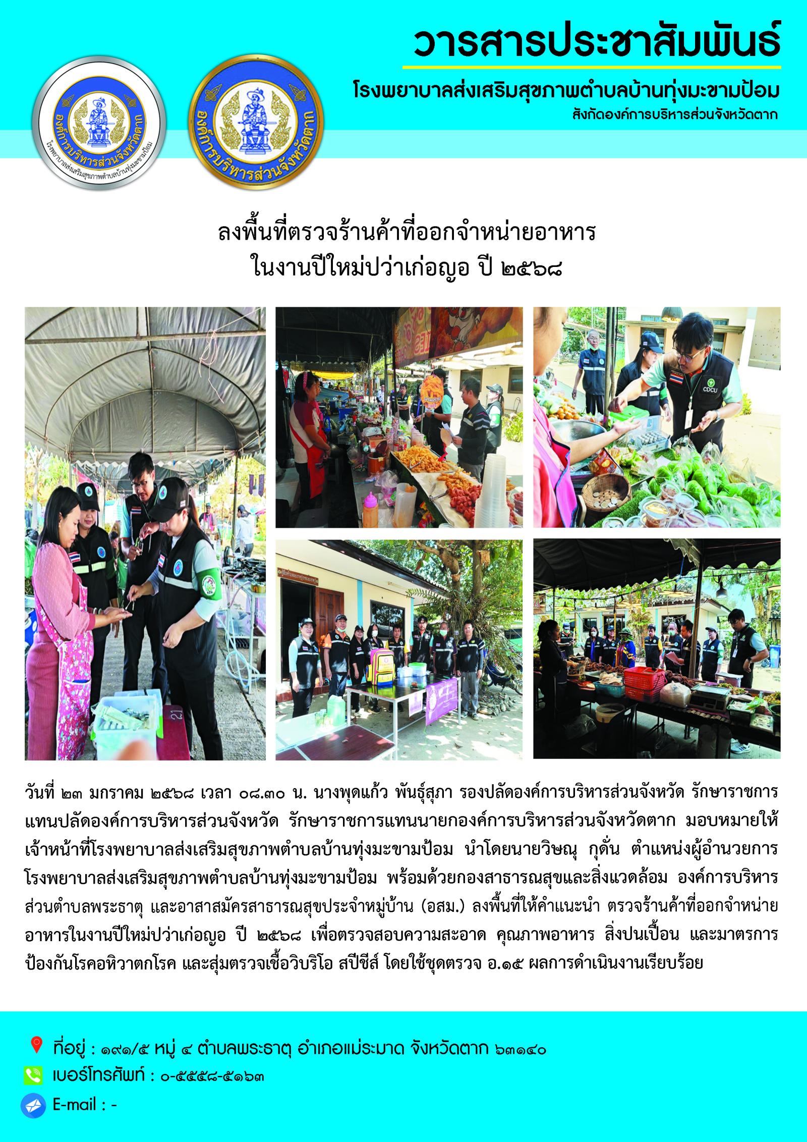 เจ้าหน้าที่โรงพยาบาลส่งเสริมสุขภาพตำบลบ้านทุ่งมะขามป้อม นำโดยนายวิษณุ กุดั่น ผู้อำนวยการโรงพยาบาลส่งเสริมสุขภาพตำบลบ้านทุ่งมะขามป้อม พร้อมด้วยกองสาธารณสุขและสิ่งแวดล้อม องค์การบริหารส่วนตำบลพระธาตุ และอาสาสมัครสาธารณสุขประจำหมู่บ้าน (อสม.) ลงพื้นที่ให้คำแนะนำ ตรวจร้านค้าที่ออกจำหน่ายอาหารในงานปีใหม่ปว่าเก่อญอ ปี ๒๕๖๘ เพื่อตรวจสอบความสะอาด