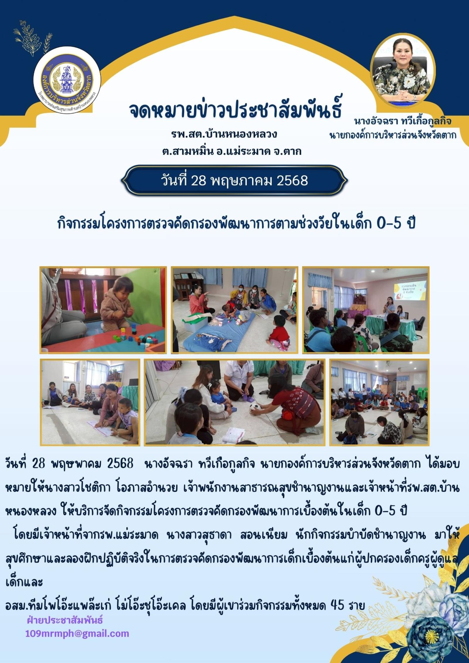 วันพุธ ที่17 ธันวาคม 68 เจ้าหน้าที่ รพ.สต.บ้านหนองหลวง ให้บริการสร้างเสริมภูมิคุ้มกันโรคด้วยวัคซีน (EPI) ในเด็ก 0-5 ปี ทั้งเด็กไทยและต่างชาติ โดยมีกิจกรรม เจาะเลือดคัดกรองความเข้มข้นของเลือด (HCT) ตรวจพัฒนาการตามช่วงวัย และ จ่ายยา para syr และ ferrous syr ณ.รพ.สต.บ้านหนองหลวง ต.สามหมื่น อ.แม่ระมาด จ.ตาก มีผู้มารับบริการทั้งหมดจำนวน 50 ราย