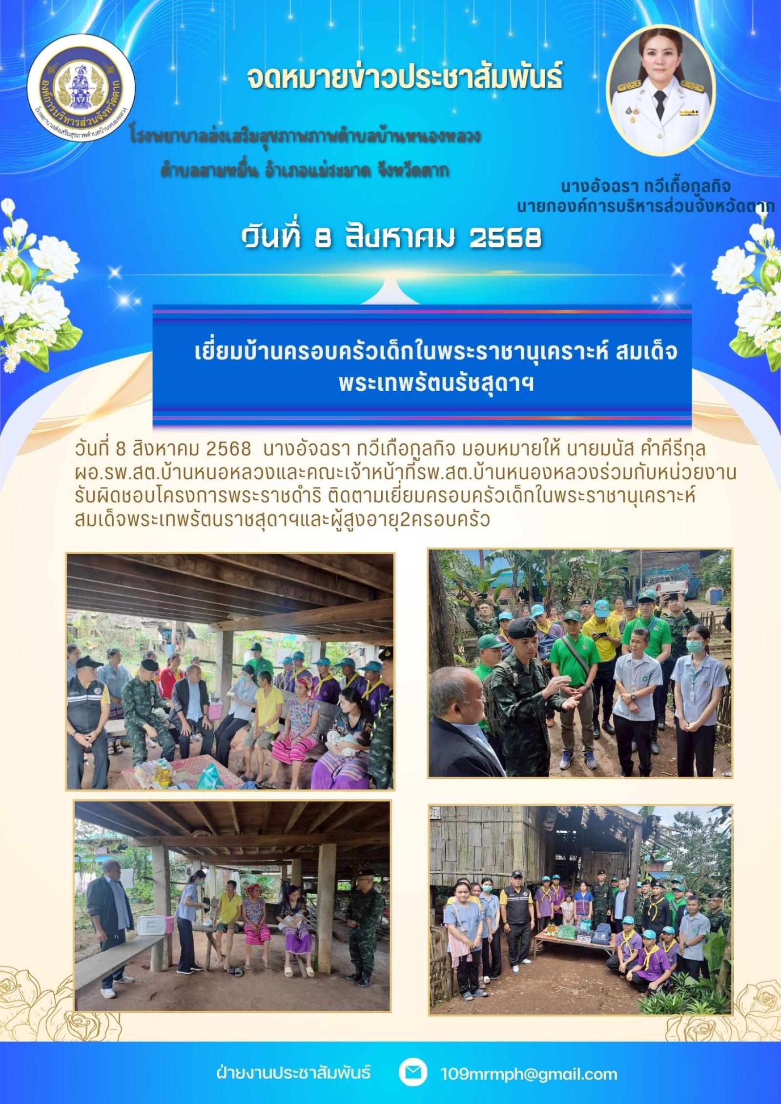 วันพุธที่ 17 ธันวาคม 2568 นางอัจฉรา ทวีเกือกูลกิจ นายกองค์การบริหารส่วนจังหวัดตาก มอบหมายให้ นายมนัส คำคีรีกูล ผู้อำนวยการโรงพยาบาลส่งเสริมสุขภาพตำบลบ้านหนองหลวง เป็นตัวแทนเข้าร่วมกิจกรรมตรวจเยี่ยมผู้ป่วยในพระราชานุเคราะห์ ในการตรวจเยี่ยมในครั้งนี้ มีผู้ป่วยเข้ารับการตรวจเยี่ยมทั้งหมด 13 ราย ทั้งนี้มีผู้ป่วยในพระราชานุเคราะห์ในเขตรับผิดชอบโรงพยาบาลส่งเสริมสุขภาพตำบลบ้านหนองหลวงเข้าร่วมกิจกรรมทั้งสิ้น 3 ราย
