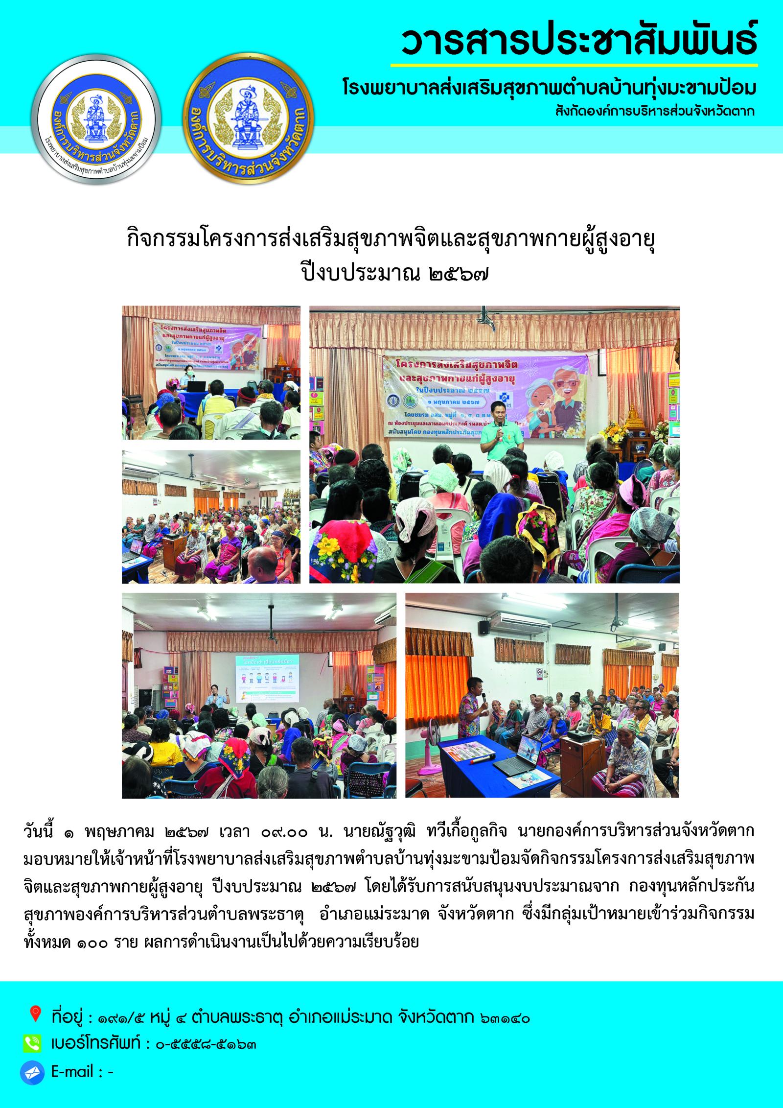 เจ้าหน้าที่โรงพยาบาลส่งเสริมสุขภาพตำบลบ้านทุ่งมะขามป้อมจัดกิจกรรมโครงการส่งเสริมสุขภาพจิตและสุขภาพกายผู้สูงอายุ ปีงบประมาณ ๒๕๖๗