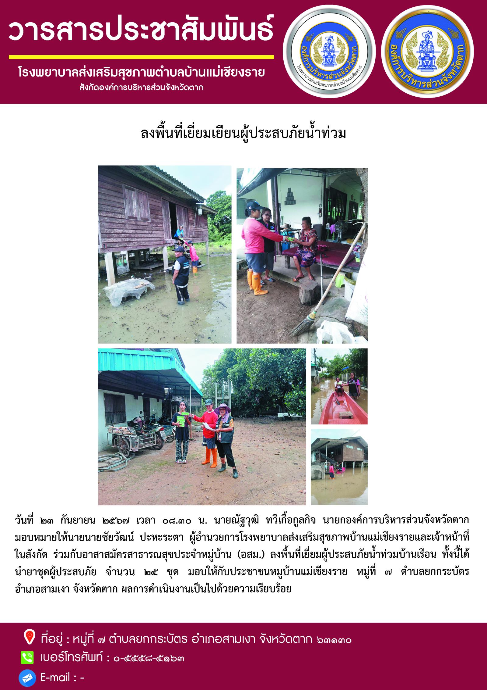วันที่ ๔ พฤศจิกายน ๒๕๖๘ เวลา ๐๘.๓๐ น. นางอัจฉรา ทวีเกื้อกูลกิจ นายกองค์การบริหารส่วนจังหวัดตาก มอบหมายให้เจ้าหน้าที่โรงพยาบาลส่งเสริมสุขภาพตำบลบ้านแม่เชียงรายร่วมกับ อสม. ลงพื้นที่ ณ บ้านแม่เชียงราย หมู่ที่ ๗ ตำบลยกกระบัตรเพื่อเยี่ยมบ้านผู้ประสบเหตุอุทกภัยและมอบชุดยาสามัญประจำบ้านและชุดยาช่วยเหลือผู้ประสบอุทกภัยจากโรงพยาบาลสามเงาและสำนักงานสาธารณสุขอำเภอสามเงา ผลการดำเนินงานเป็นไปด้วยความเรียบร้อย